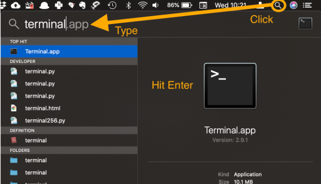 Open Terminal using the Spotlight Search in the righthand corner of the Menu Bar.